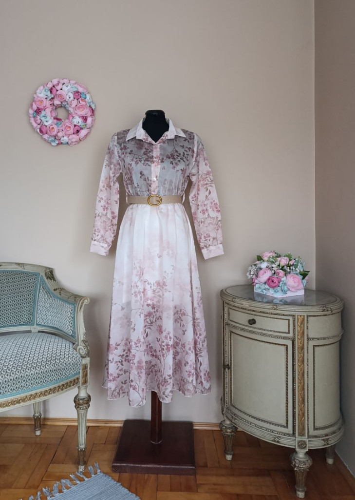 A ruha felső része gombos és enyhén átlátszó ( testszínű trikót lehet alá venni). Az öv alatt gumis a ruha