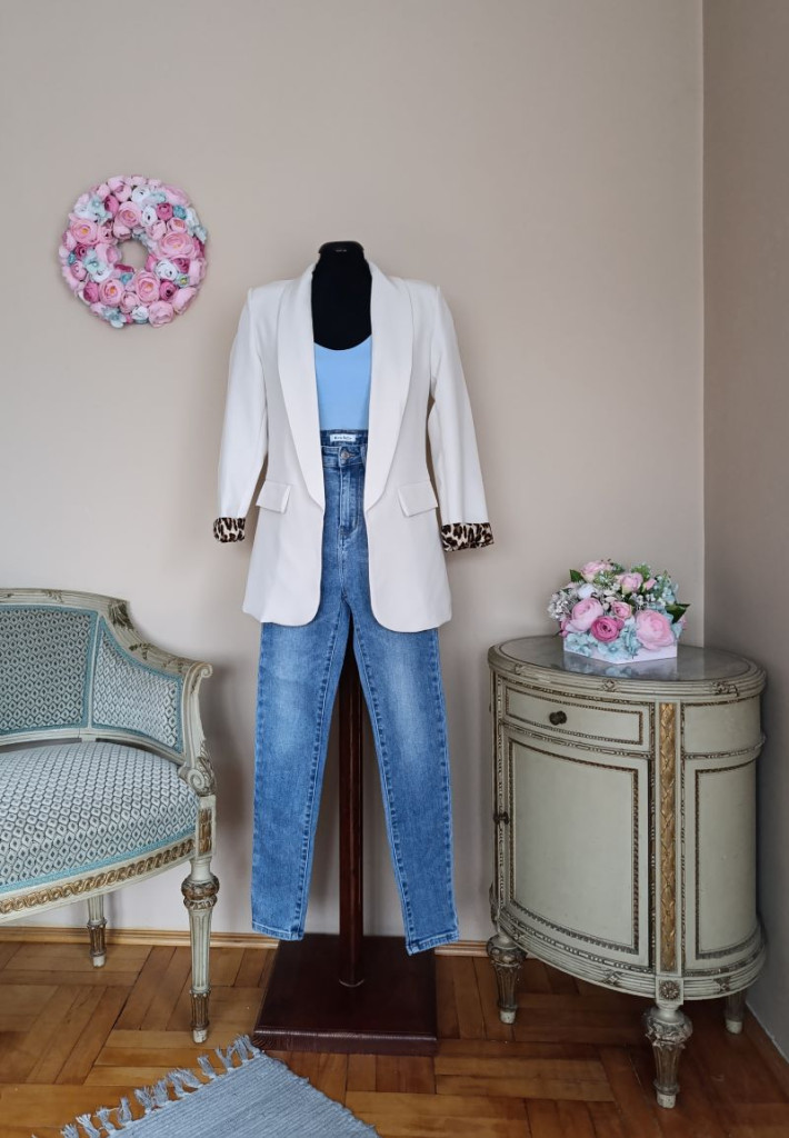 A blézer méret nélküli, S-M, kisebb L méretig ajánlott. Hossza 67 cm, mellbősége 100 cm-ig jó