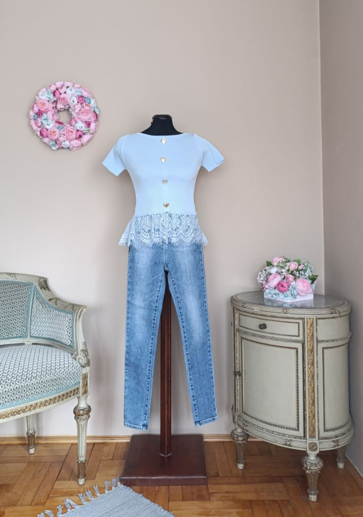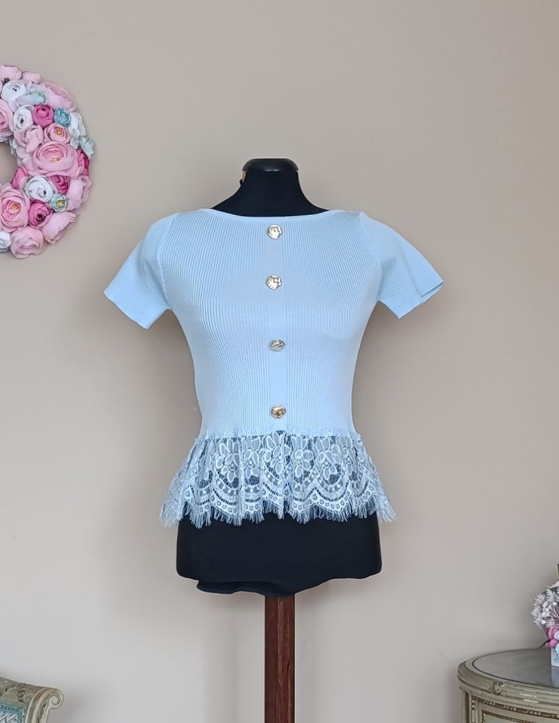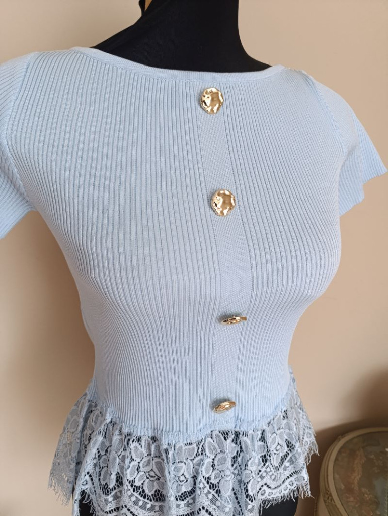 A felső anyagában bordázott, méret nélküli, XS-M, kisebb L méretig ajánlott. Teljes hossza 56 cm, ebből a csipke 12 cm, mellbőségeb 80-100 cm-ig jó.