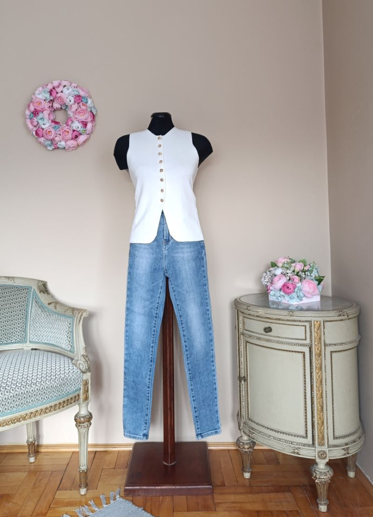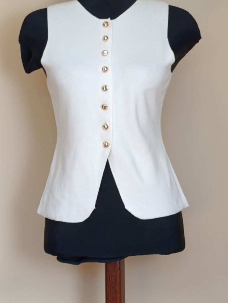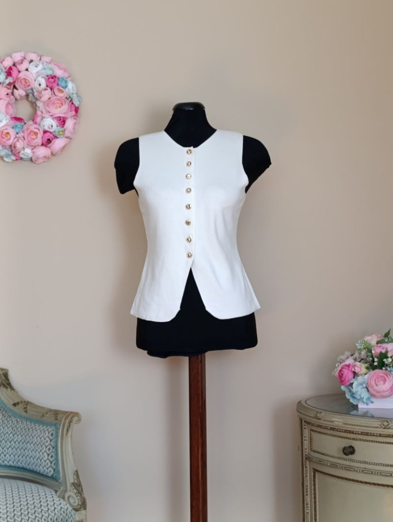 A mellény méret nélküli, S-M, kisebb L méretig ajánlott. Hossza hátul válltól mérve 55 cm, mellbősége 88-99 cm-ig jó