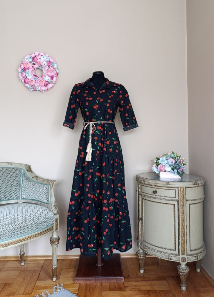 A ruha méret nélküli, S-M méretig ajánlott. Hossza 131 cm, mellbősége 95 cm, derék max 90. A ruha derékvarrással rendelkezik.