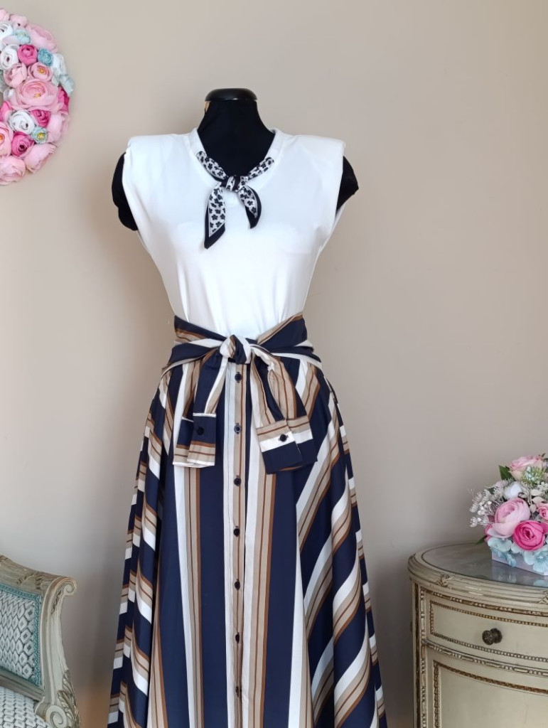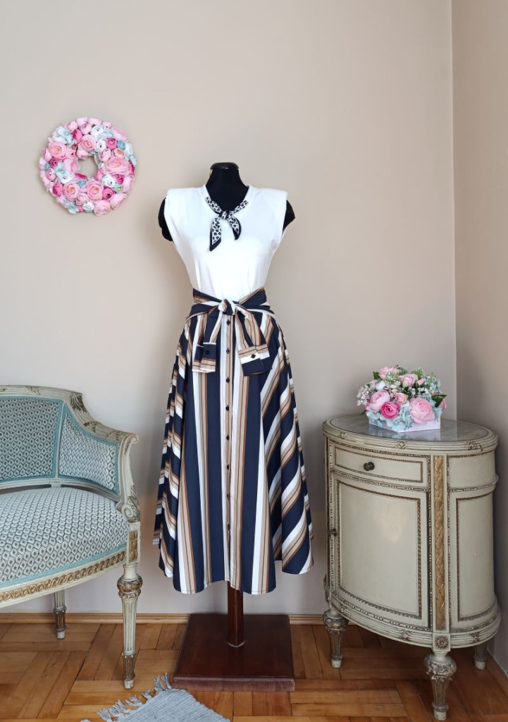 A szoknya méret nélküli, S-M méretig ajánlott. Dereka nem gumis, így maximum 70-71 cm-s derékra lesz jó, viszont végig gombos, így akinek szélesebb