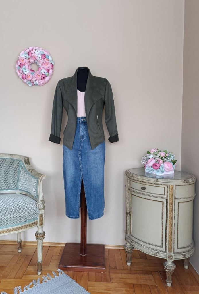 A kabát méret nélküli S-L méretig ajánlott. Rugalmas anyagú, hossza hátul 52 cm