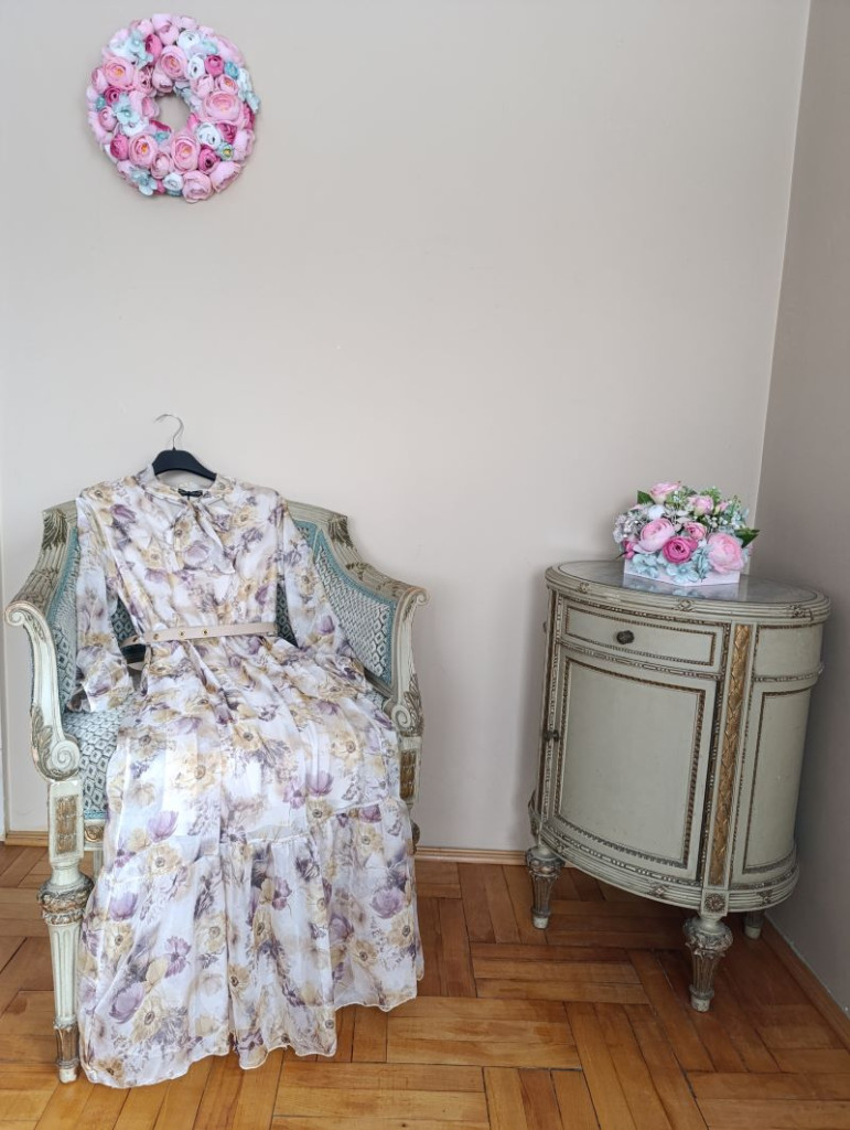 A ruha méret nélküli, XS-M méretig ajánlott. Hossza 120 cm, alsó szoknya hossza 87 cm, mellbősége 97 cm-ig jó, az öv résznél mell alatt gumis a ruha