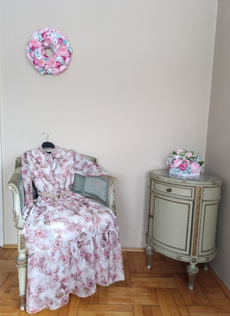 A ruha méret nélküli, XS-M méretig ajánlott. Hossza 120 cm, alsó szoknya hossza 87 cm, mellbősége 97 cm-ig jó, az öv résznél mell alatt gumis a ruha