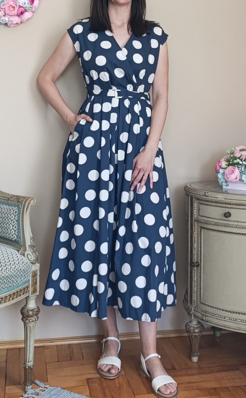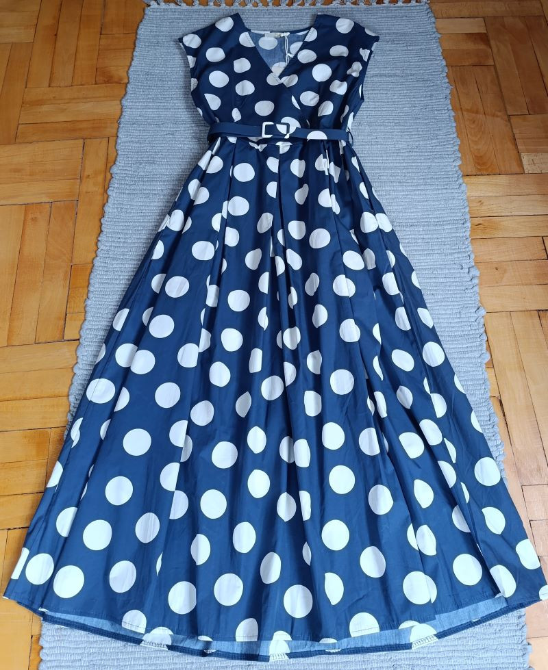 A ruha méret nélküli, erősebb S mérettől L méretig ajánlott. Hossza 127 cm, mellbősége 90-100 cm-ig jó, derék max 86 cm, a szoknyarész zsebes