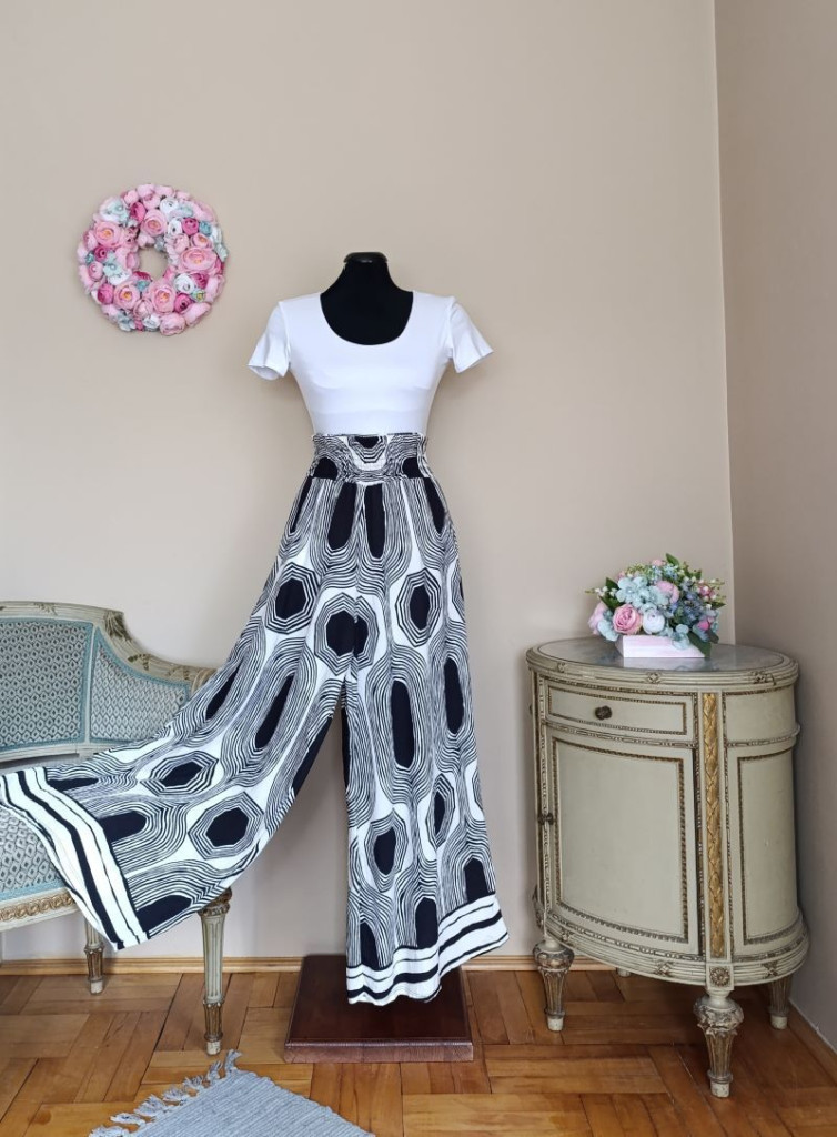 A szett részei a gumis derekú bő szárú nadrág és a mintás felső.
