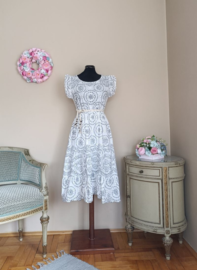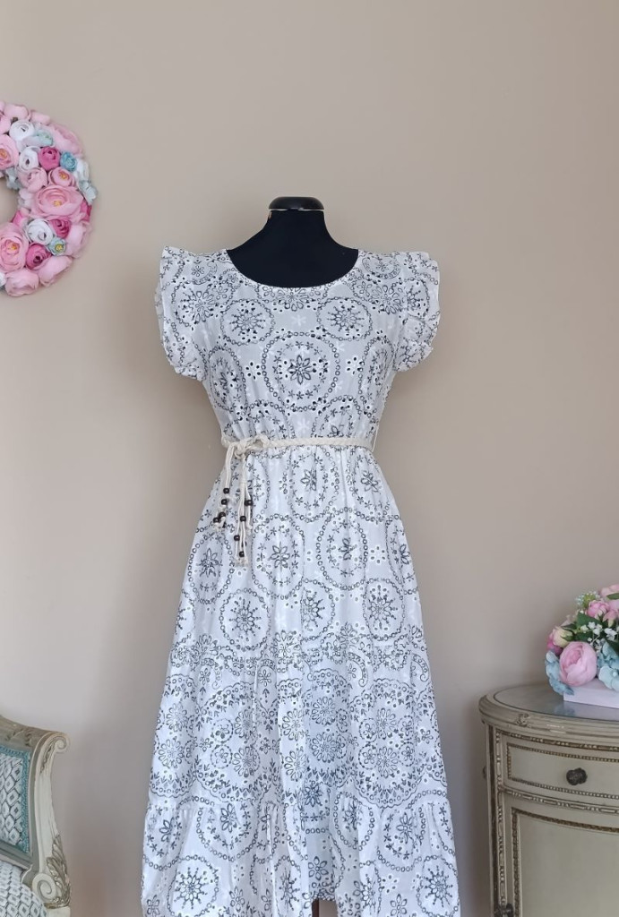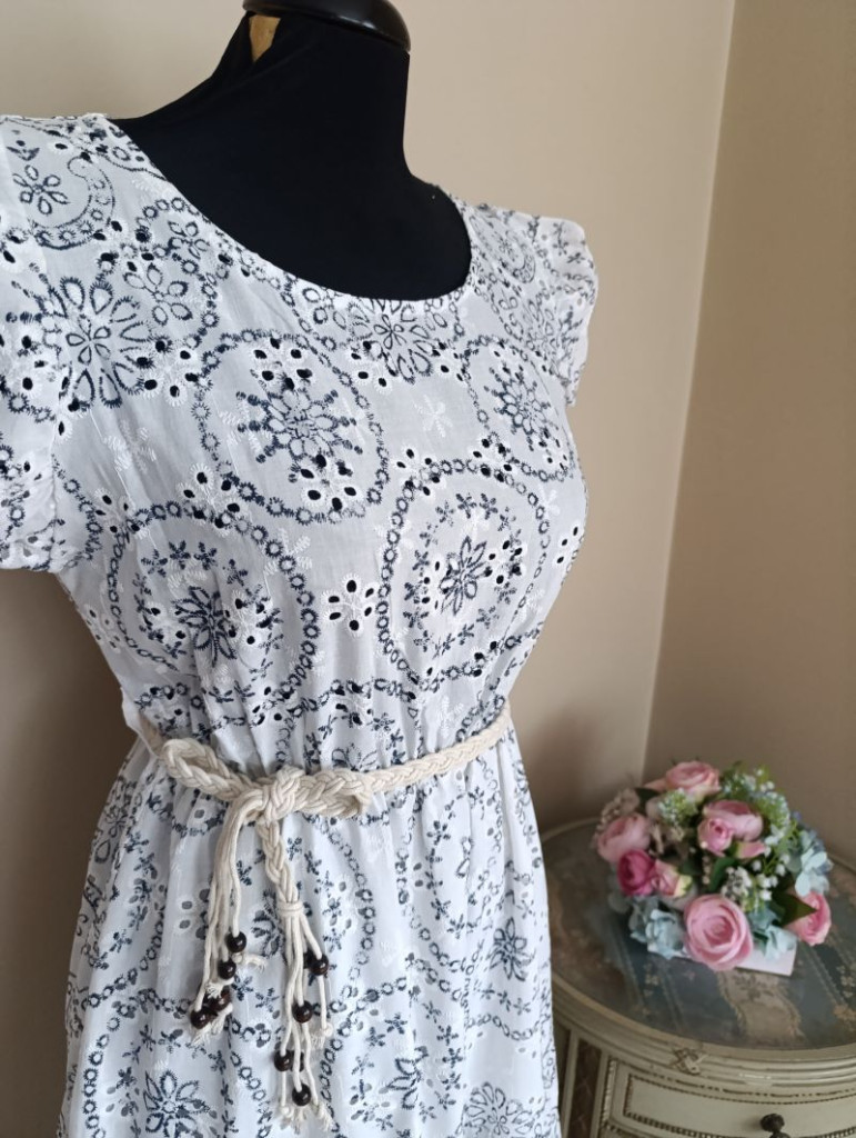 A ruha méret nélküli, S-L méretig ajánlott. Hossza 107 cm, mellbősége 86-100 cm-ig jó, az öv résznél gumis a ruha.