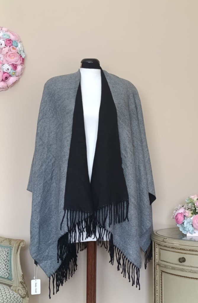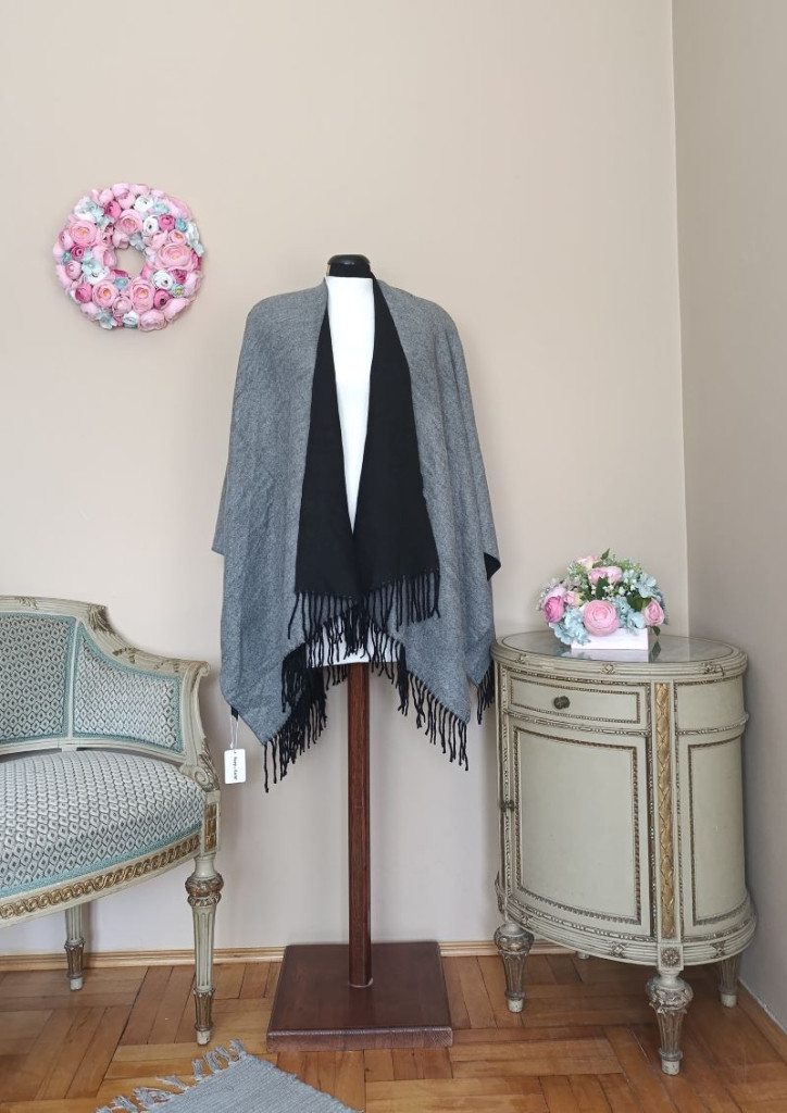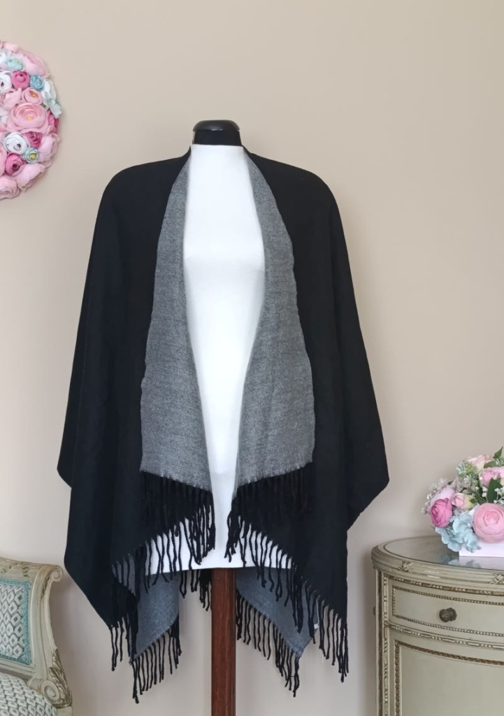 A poncsó nagyon puha, egyik oldala fekete, másik szürke, bármelyik oldalával hordható.