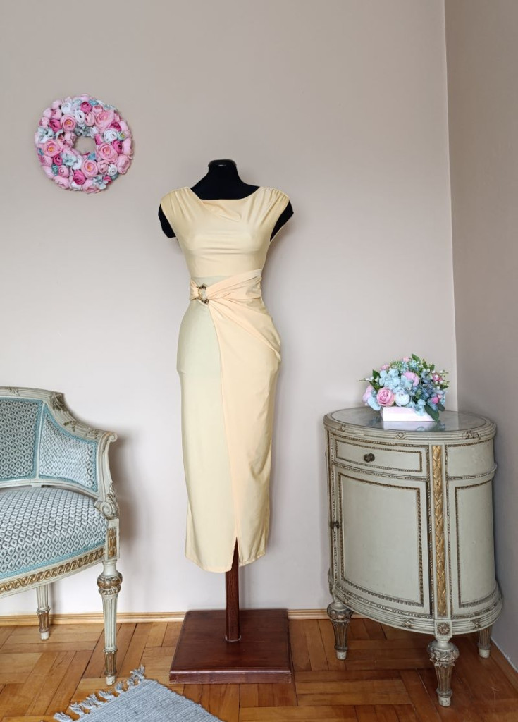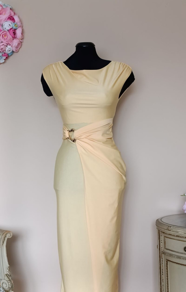 A ruha alakkövető, méret nélküli, XS-M méretig ajánlott. Hossza 120 cm, mellbősége 80-95 cm-ig nyúlik, dereka 60-80 cm-ig nyúlik