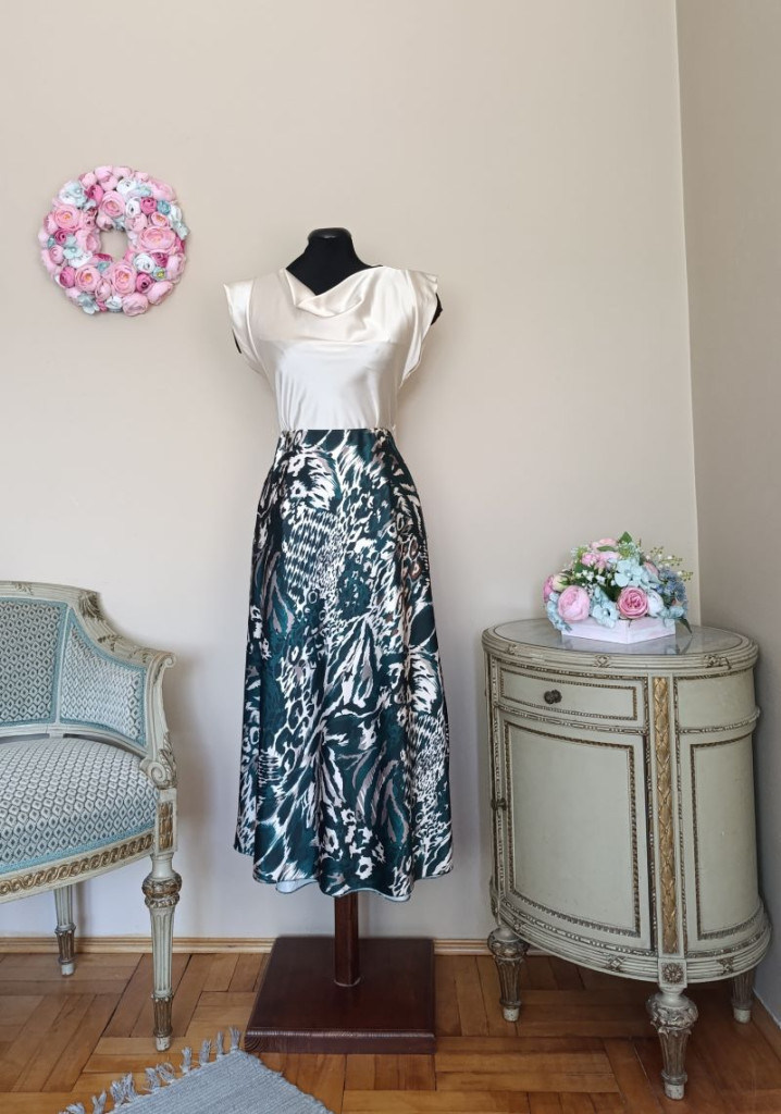 A szoknya méret nélküli, S-L méretig ajánlott. Hossza 84 cm, dereka gumis 68-84 cm-ig jó