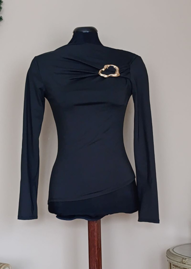 A felső feszülős, aszimmetrikus fazonú. Méret nélküli, S-M, kisebb L méretig ajánlott. Teljes hossza 56 cm, a legrövidebb részén