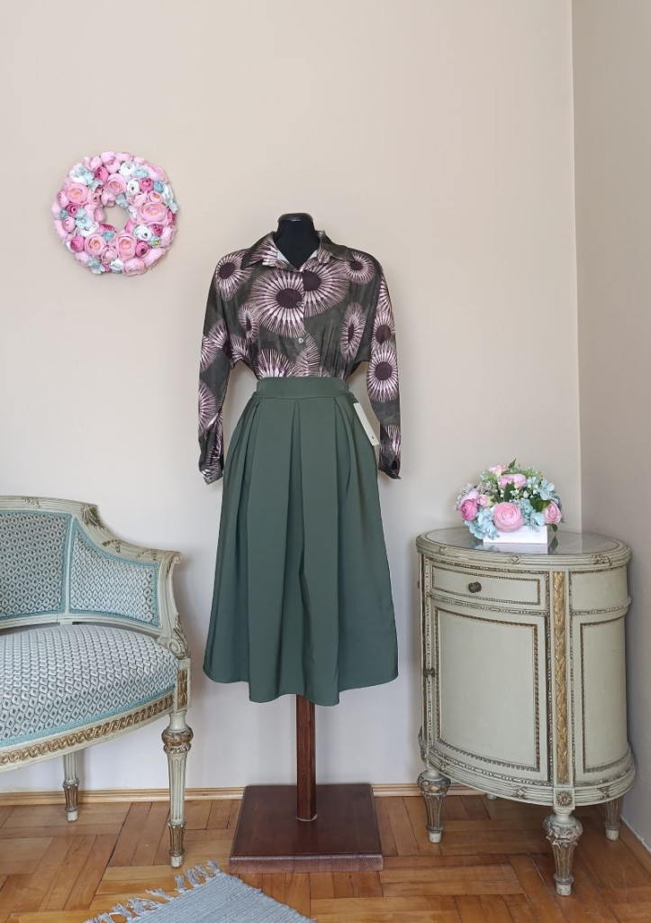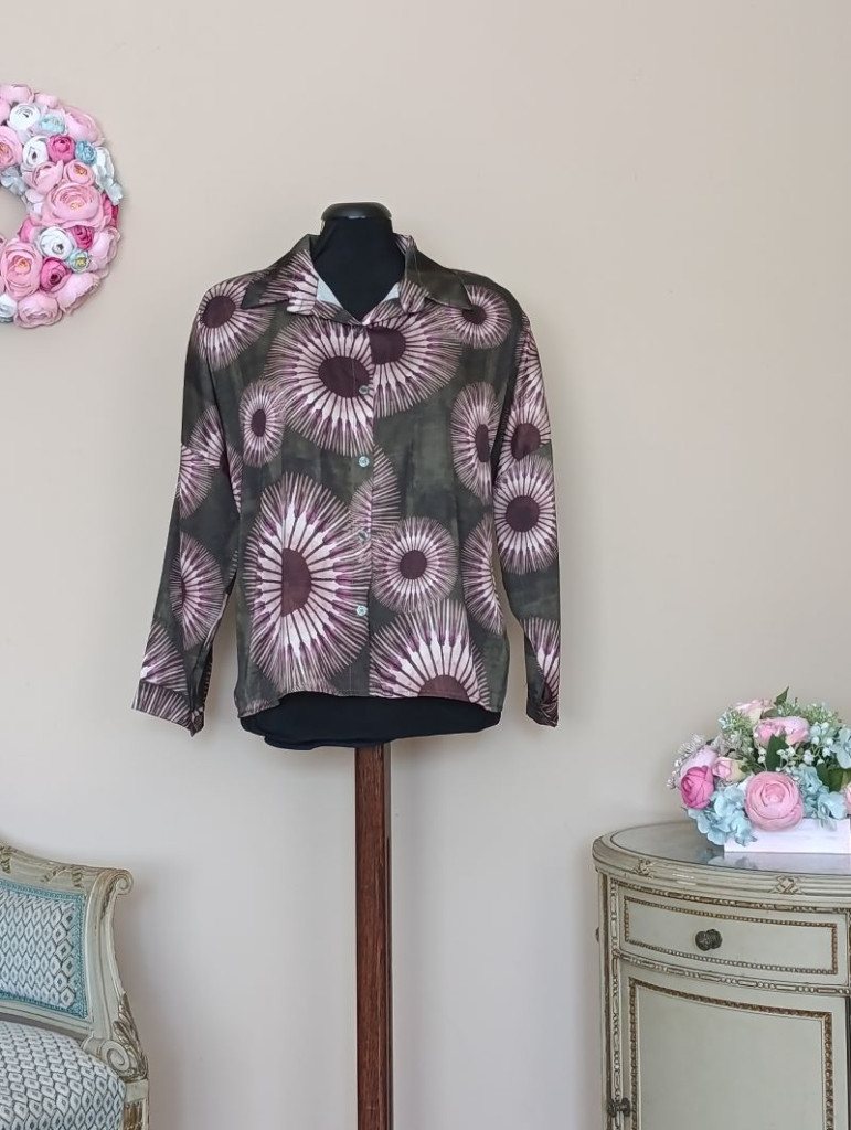 A blúz lezserebb fazonú, méret nélküli, M-L méretig ajánlott. Hossza 58 cm, mellbősége 115 cm