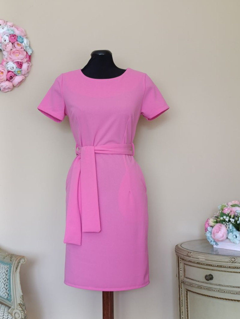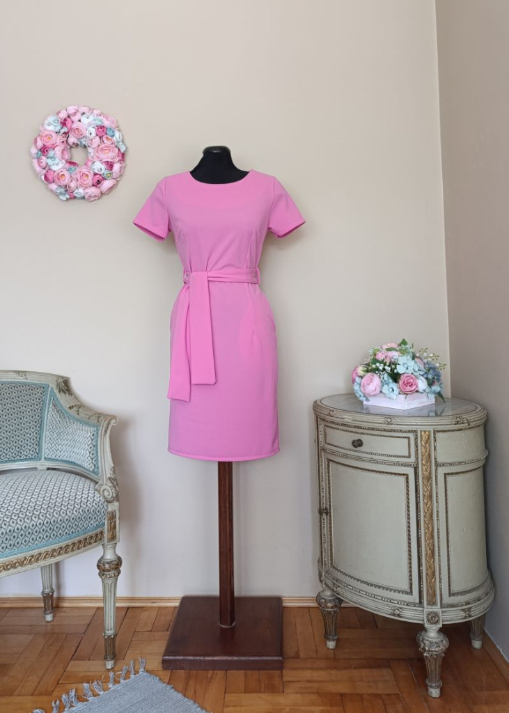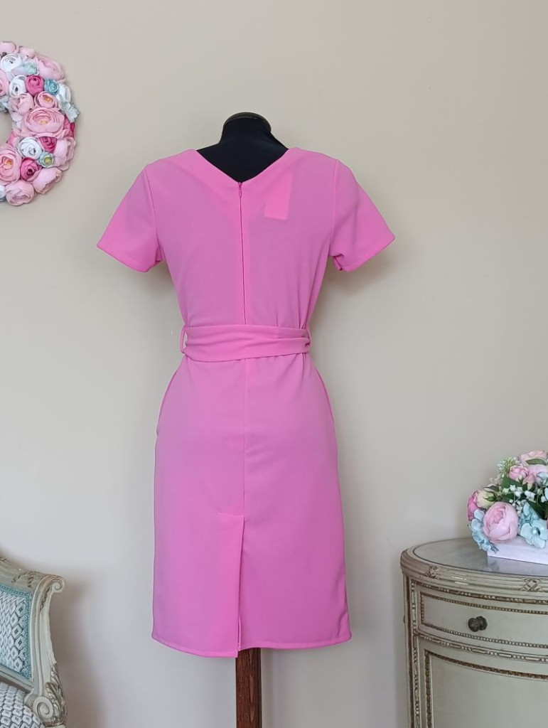 Háta cipzáros, illetve hátul még 22 cm slicc van a ruhán, a szoknyarész zsebekkel rendelkezik.