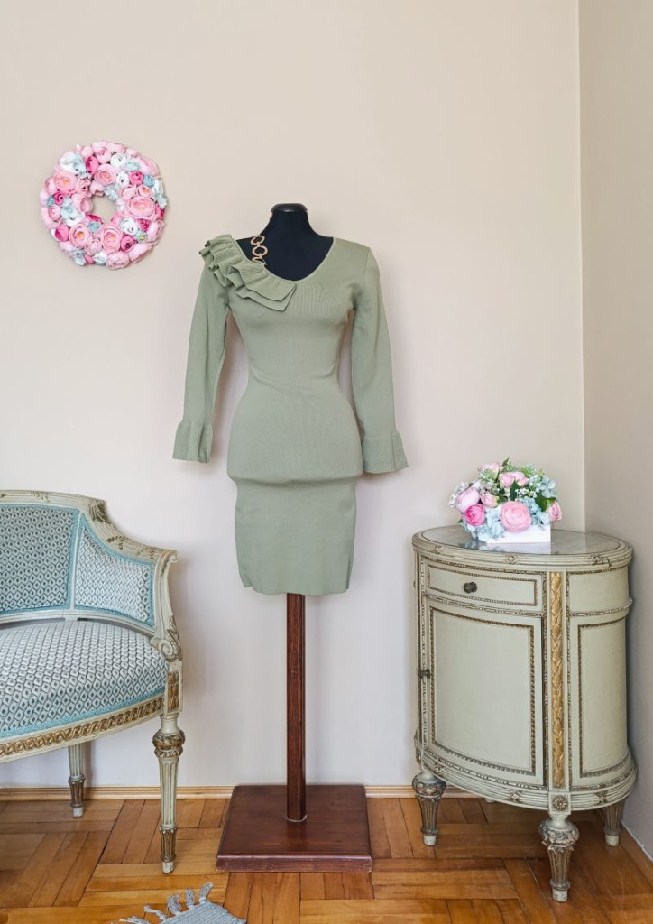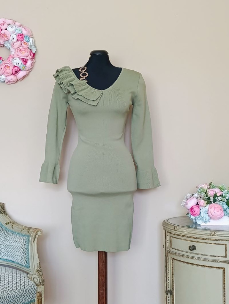 Kötött jellegű, de vékonyabb, kellemes anyagú ruha, alakkiemelős fazon.