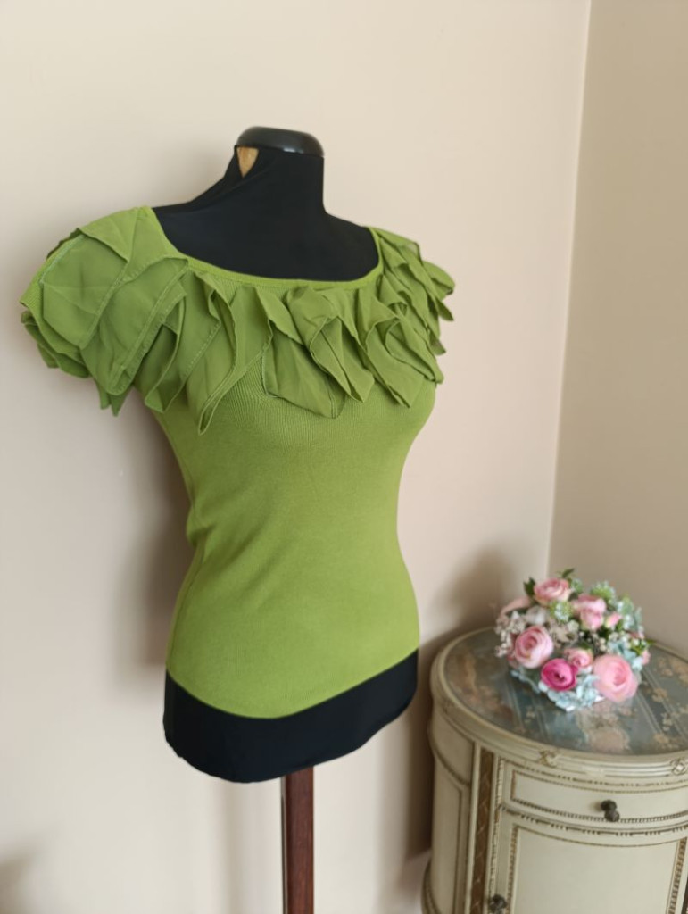 A felső méret nélküli, S-M méretig ajánlott. Hossza válltól mérve 53 cm, mellbősége 83-100 cm-ig nyúlik