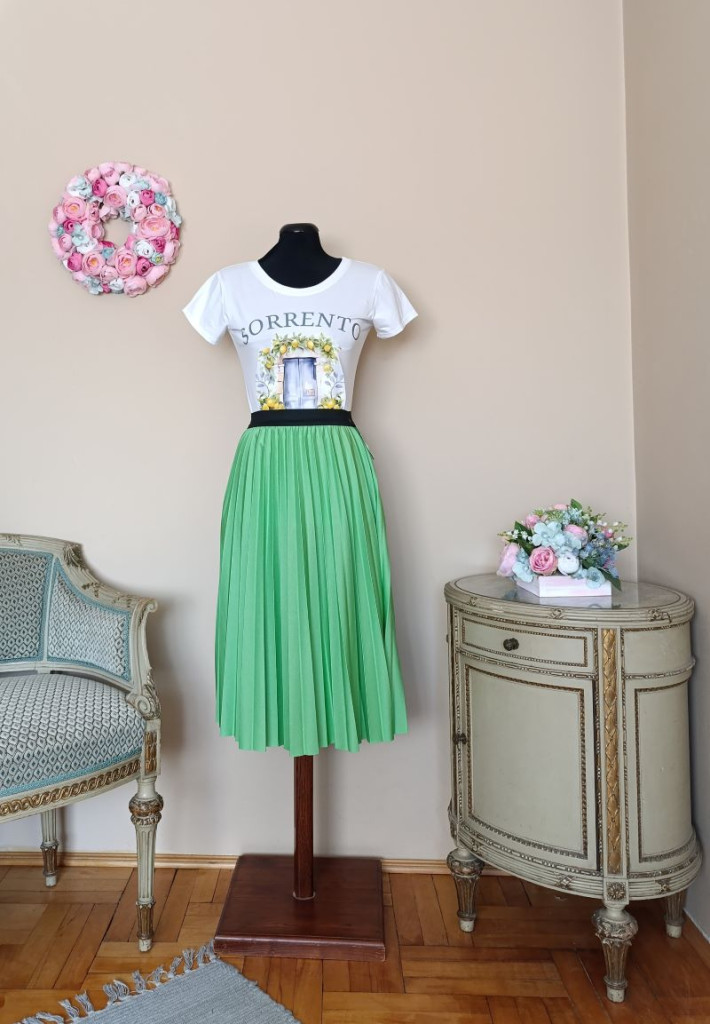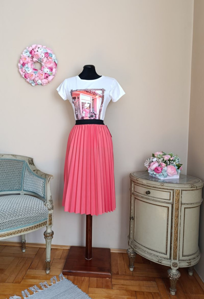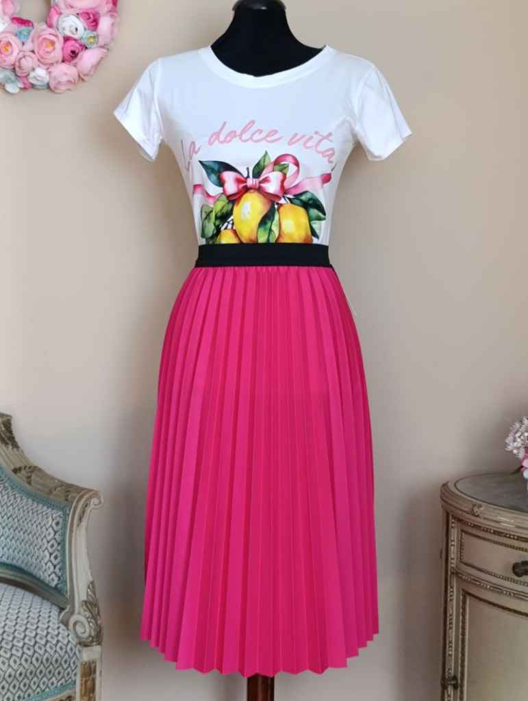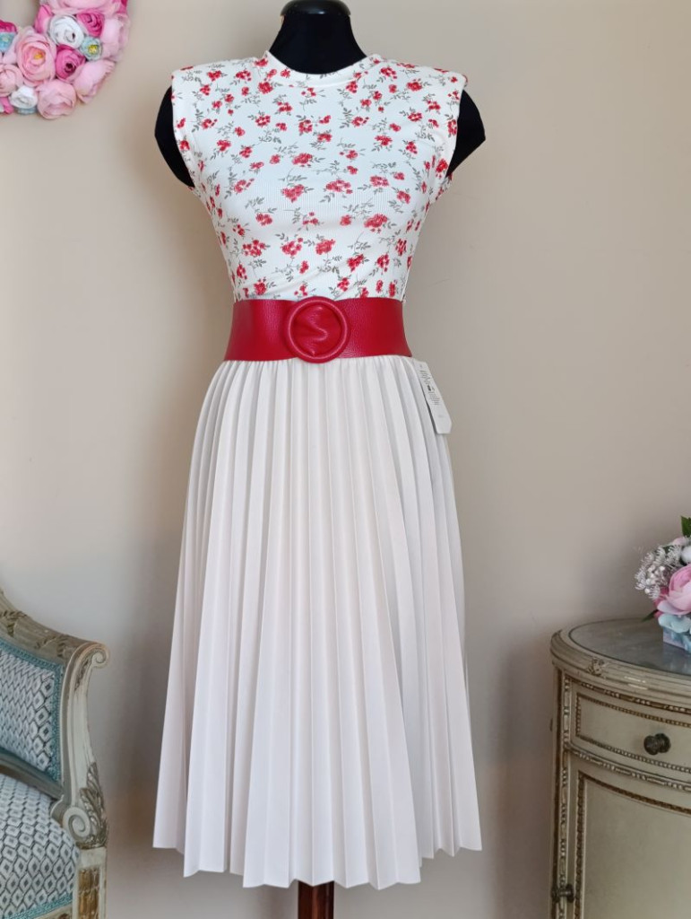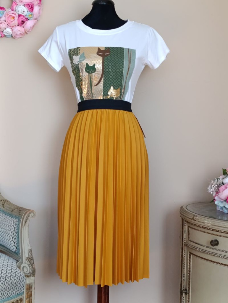 Színek: rozsda, zöld, mustár, rózsaszín (kicsit cukorkás, élénk, korallos), világos krém, pink (a bézs szoknyán lévő piros öv külön megvásárolható, nem a szoknya része))