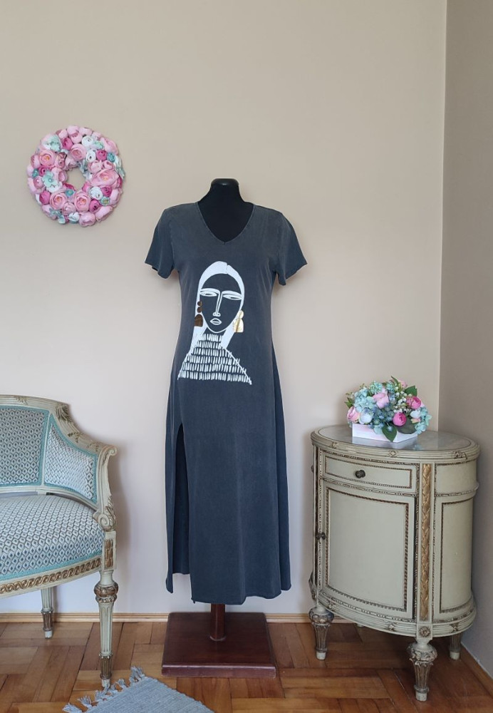 A póló ruha méret nélküli, S-L méretig ajánlott. Hossza 123 cm, mellbősége 92-110 cm-ig jó, derék 86-100 cm-ig nyúlik, jobb oldalt 55 cm a slicc,
