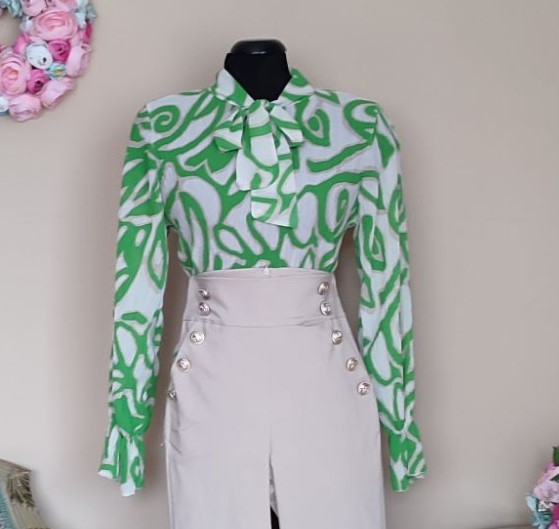 A blúz anyagában gyűrt, méret nélküli, S-L méretig ajánlott. Hossza 61 cm , mellbősége 92- 104 cm-ig jó