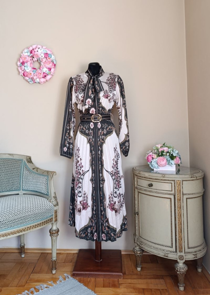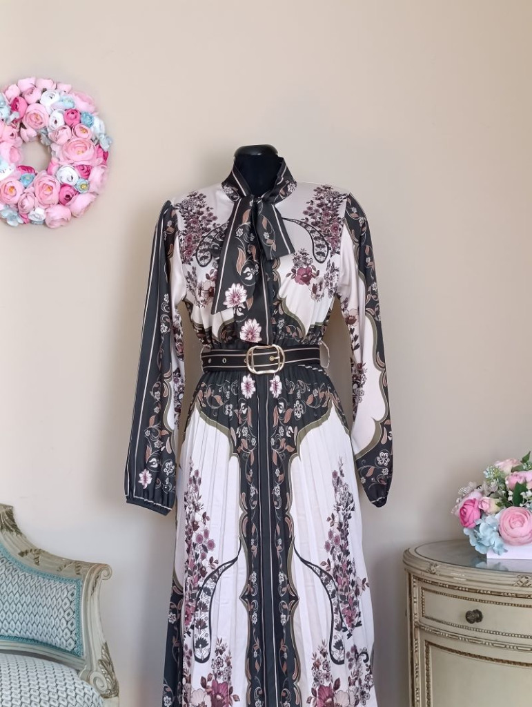A ruha méret nélküli, S-L méretig ajánlott. Hossza 125 cm, mellbősége 90-104 cm-ig jó, a felső rész gombos, az öv alatt pedig gumis a ruha.