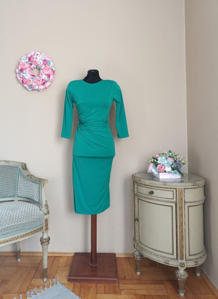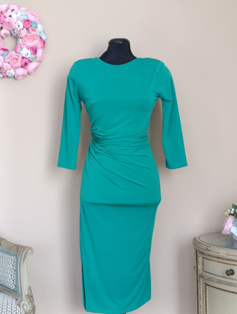 A ruha méret nélküli, S-M, kisebb L méretig ajánlott. Hossza 107 cm, mellbősége 80-103 cm-ig jó, jobb oldalt 23 cm slicc, válltöméssel rendelkezik