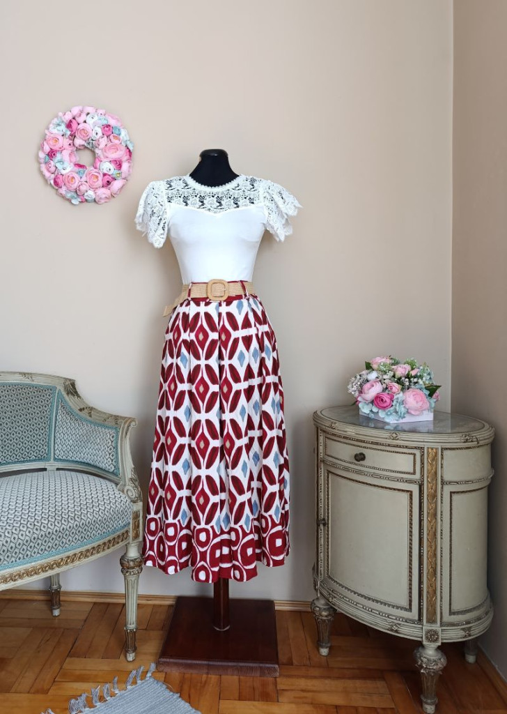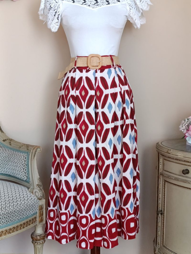 A szoknya méret nélküli, S-L méretig ajánlott. Hossza 86 cm, dereka gumis 70-89 cm-ig jó, a szoknya zsebes :)